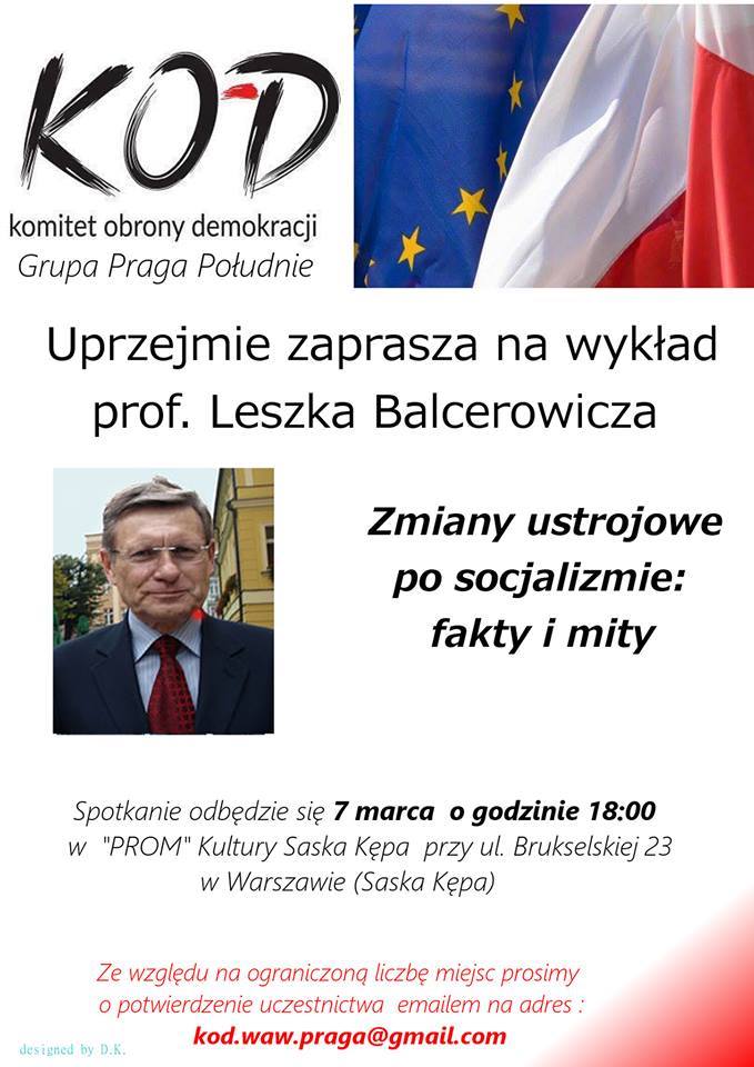 7 marca (poniedziałek) o godzinie 18.00 odbędzie się już drugie spotkanie organizowane przez Komitet Obrony Demokracji - Grupa Praga-Południe. Tym razem wykład poprowadzi profesor Leszek Balcerowicz, a tematem będą "Zmiany ustrojowe po socjalizmie: fakty i mity".