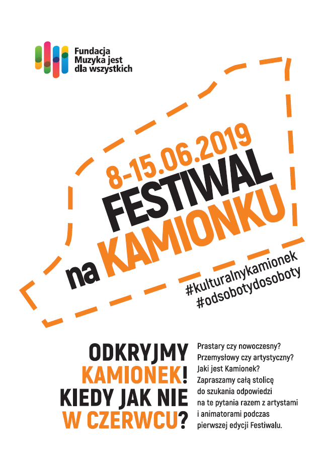 Festiwal pozwoli Wam poznać współczesność Kamionka, ludzi działających na rzecz społeczności lokalnych, ciekawych artystów i organizacje pozarządowe. Odbywać się będzie pod patronatem Burmistrza Dzielnicy Praga-Południe Tomasza Kucharskiego i dzięki dofinansowaniu Miasta St.Warszawy.