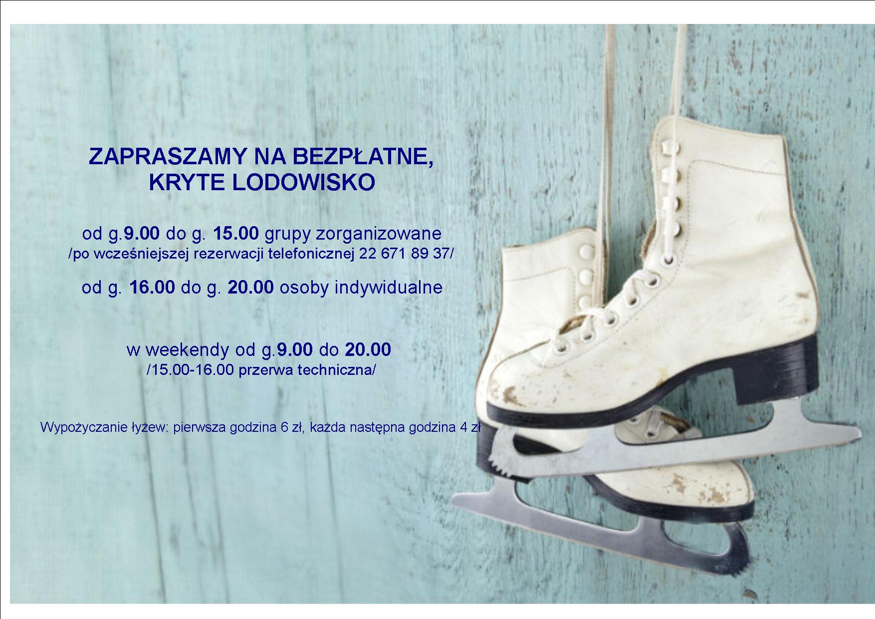 - w godzinach 9.00 - 20.00 - w soboty i niedziele (o godzinie 15.00 odbywa się godzinna przerwa techniczna i lodowisko jest niedostępne);