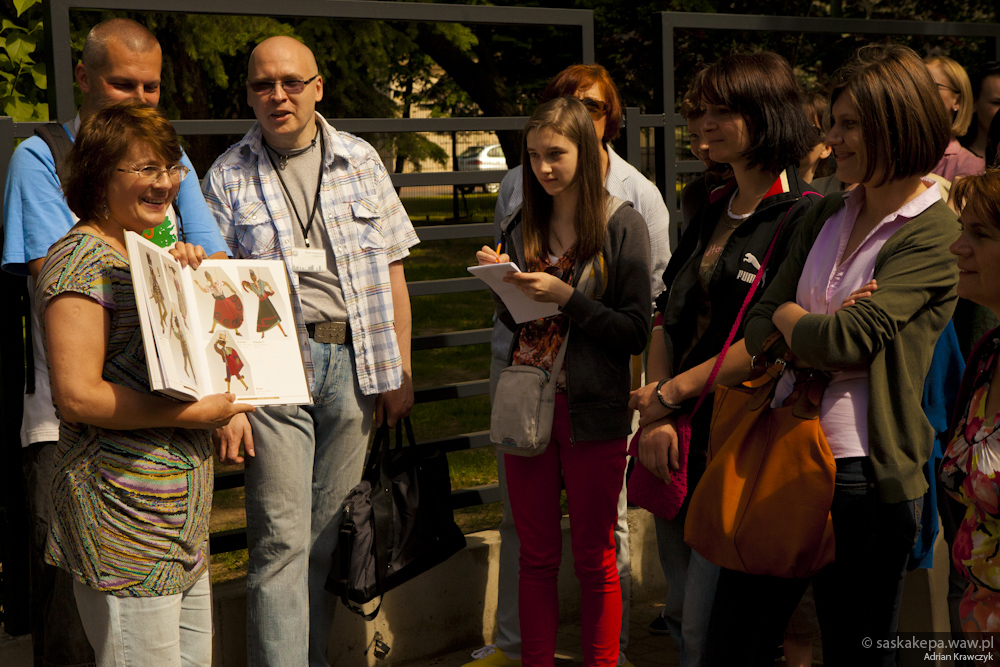 Nie mogliśmy oczywiście ominąć ul. Dąbrowieckiej, gdzie szczególnie zapachniało Saską Kępą przy mieszkaniu Agnieszki Osieckiej. Poznaliśmy też historię kościoła przy ulicy Nobla, posłuchaliśmy krótkiej opowieści o płaskorzeźbie Plon i zakończyliśmy spacer na Placu Przymierza.