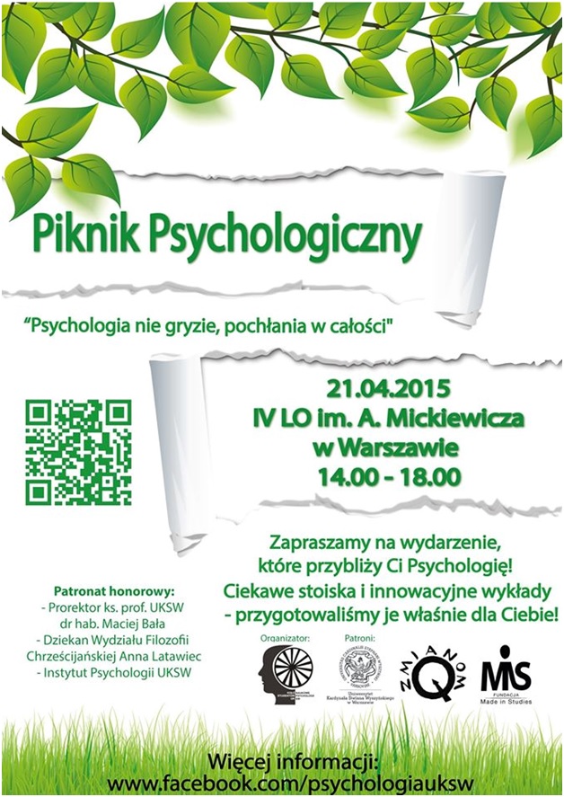 21 kwietnia w godzinach 14.00 – 18.00 w IV LO im. A. Mickiewicza przy ul. Saskiej 59 będzie miał miejsce Piknik Psychologiczny. Patronat nad wydarzeniem objął Prorektor ks. Prof. UKSW dr hab. Maciej Bała, Dziekan Wydziału Filozofii Chrześcijańskiej Anna Latawiec oraz Instytut Psychologii UKSW. Piknik jest związany z finałem międzyszkolnego konkursu psychologicznego „W grupie siła”, którego patronem jest Burmistrz Dzielnicy Praga-Południe Tomasz Kucharski.