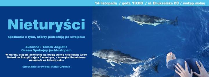 Ona biolog, przede wszystkim ptakolub, on- przedsiębiorczo chce świat zmieniać, łączy ich wspólna pasja - podróżowanie. W 2012 roku spakowali plecaki i wyruszyli w podróż lądowo-morską do Ameryki Południowej. Chcieli doświadczyć drogi, poczuć odległości, zobaczyć jak powoli zmieniają się krajobrazy, wsie, miasteczka. W Maroku łapali jachtostopa na drugą stronę niebieskiej wody. Podróż do Brazylii przez Wyspy Kanaryjskie, Zielonego Przylądka zajęła 3 miesiące, a Ameryka Południowa wciągnęła na kolejny rok. Ale wracając do jachtostopa- co i jak, gdzie i dlaczego, dlaczego żeglarzom czas inaczej płynie i wiele innych pytań, anegdot, historii śmiesznych i smutnych postarają się opowiedzieć na kolejnym spotkaniu Nieturystów!