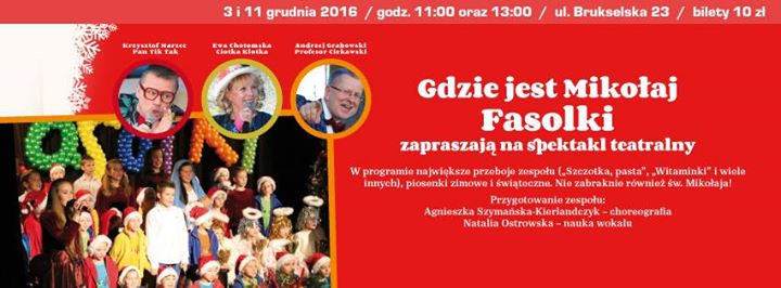 Fasolki – zespół wokalno-taneczny zapraszają wraz ze swoimi „Rodzicami”: Ewą Chotomską – Ciotką Klotką, Krzysztofem Marcem – Panem Tik Takiem i Andrzejem Grabowskim – Profesorem Ciekawskim zapraszają na spektakl teatralny pt. „Gdzie jest Mikołaj”. W programie największe przeboje zespołu („Szczotka, pasta”, „Witaminki” i wiele innych), piosenki zimowe i świąteczne. Nie zabraknie również św. Mikołaja!