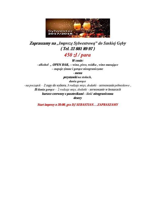 ZAPRASZAMY NA WSPÓLNĄ ZABAWĘ SYLWESTROWĄ DO SASKIEJ GĘBY. PYSZNE JEDZENIE, OPEN BAR -( WÓDKA, WINO, PIWO I SUPER MUZYKA. )