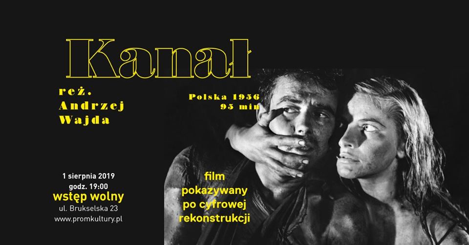 "Kanał”, reż. Andrzej Wajda, Polska 1956, 95 min Dramat / wojenny. Ostatnie chwile Powstania Warszawskiego: oddział żołnierzy AK próbuje przejść przez kanały do broniącego się jeszcze Śródmieścia. Nagroda Specjalna na Festiwalu Filmowym w Cannes. Film pokazywany po cyfrowej rekonstrukcji . Wydarzenie z okazji Narodowego Dnia Pamięci Powstania Warszawskiego. Wstęp wolny.
