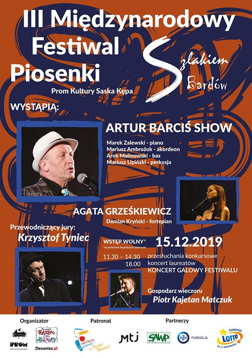 godz. 11.30 - sala widowiskowa: konkurs główny - koncert konkursowy III MFP Szlakiem Bardów, przewodniczący jury: Krzysztof Tyniec, wstęp wolny